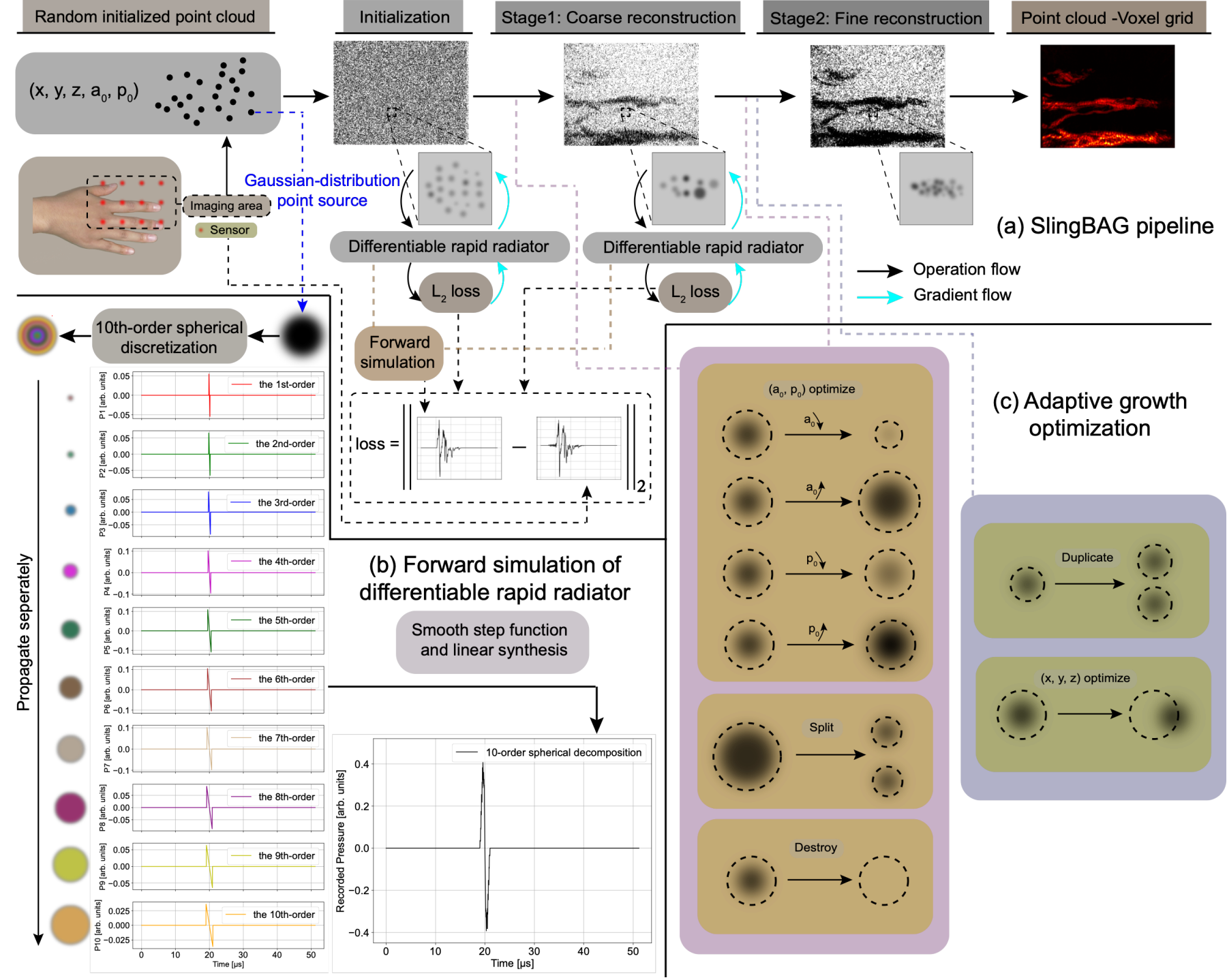 研究团队提出了一种全新的范式,摒弃了传统的均匀体素网格表示法,转而采用点云形式存储光声源信息。如图1所示,SlingBAG(Sliding Gaussian Ball Adaptive Growth,滑动高斯球自适应生长)算法将3D光声场景建模为一系列高斯分布的球形源。在迭代过程中,算法不仅持续优化每个高斯源的峰值强度(初始压力)、标准差(大小)和均值(位置),还引入了自适应密度优化机制:高斯源会根据自身强度和标准差大小进行自适应的“销毁”、“分裂”和“复制”。
