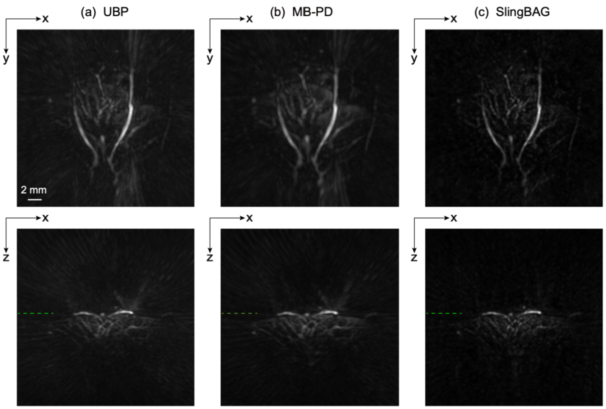 为了进一步评估临床及科研应用价值,研究团队利用SlingBAG对半球形超声换能器阵列对活体小鼠大脑、大鼠肾脏和肝脏成像的真实数据进行了重建。结果显示,SlingBAG算法重建的图像伪影显著减少,血管细节更加清晰可见,对比度显著优于传统方法。例如在小鼠肝脏重建(图3)中,SlingBAG的对比噪声比(CNR)达到42.01,远高于UBP(30.62)和MB-PD(37.28)。
