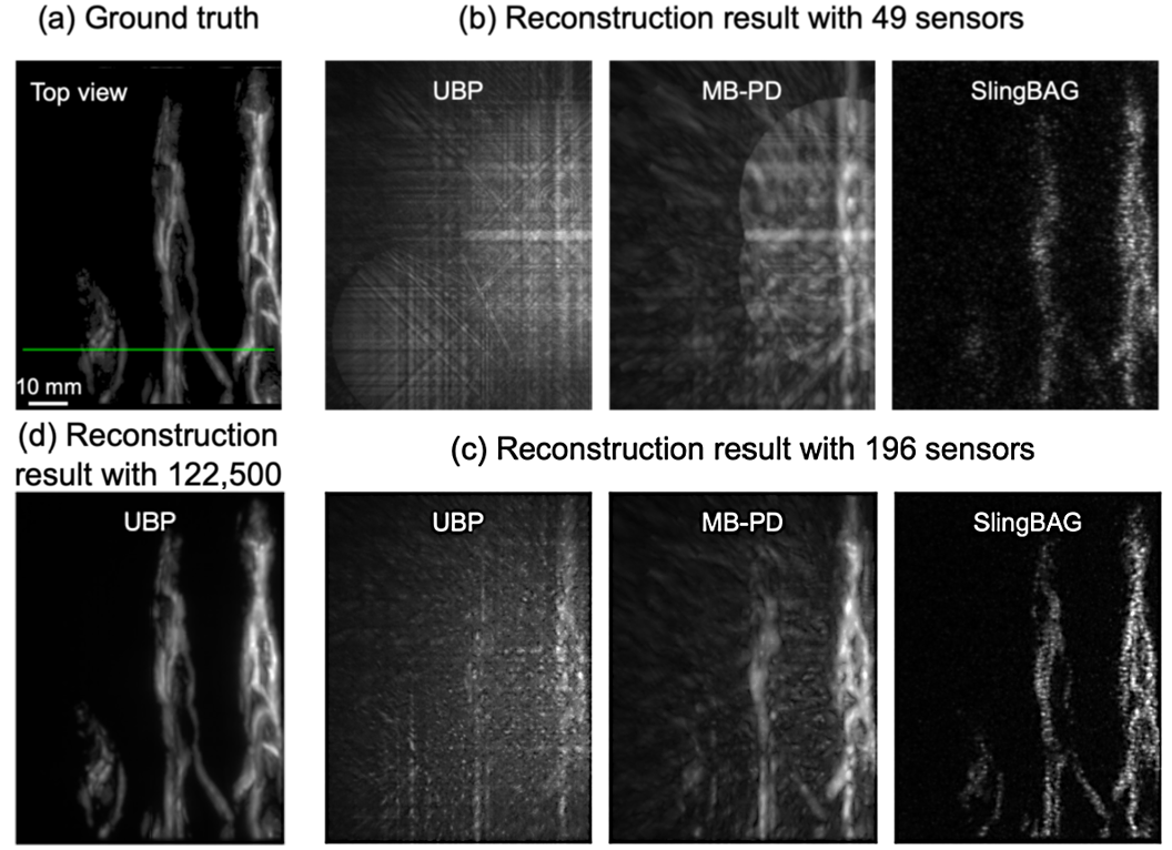 研究团队首先利用模拟的手部血管数据检验了SlingBAG算法的高质量重建能力。如图2所示,在极度稀疏的传感器配置下(如49个、196个传感器),传统的通用反投影(UBP)算法产生的图像具有严重伪影,血管几乎无法辨认,而传统的基于模型的点探测器(MB-PD)算法虽然有所改善,但仍存在明显模糊。相比之下,SlingBAG算法表现出卓越的重建能力,即便仅使用49个传感器也能重建出明显的原始血管轮廓。当传感器数量增加到196个时,SlingBAG已能实现大部分血管精细结构高质量重建,而其他算法仍存在严重的伪影。